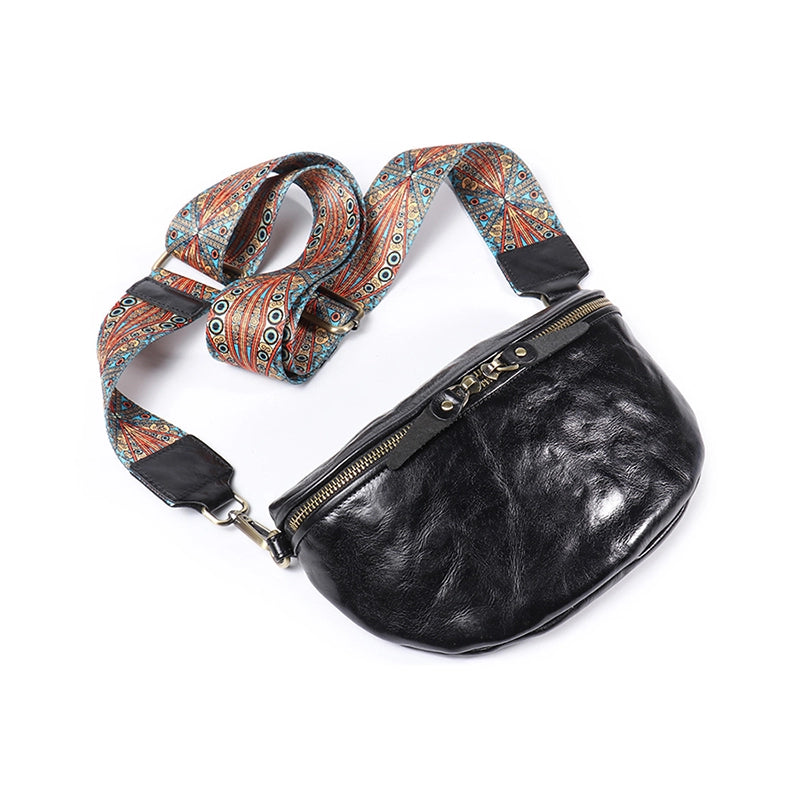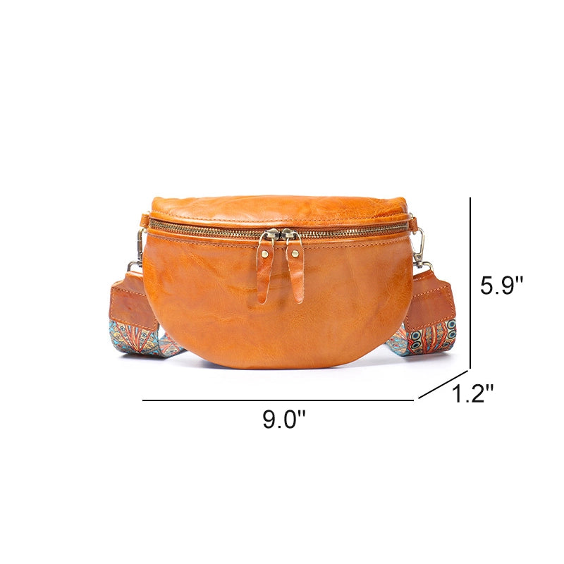 This crossbody sling bag features a smooth, curved silhouette inspired by crescent shapes, crafted from rich vegetable-tanned leather. Its sleek design offers a perfect blend of style and everyday functionality.